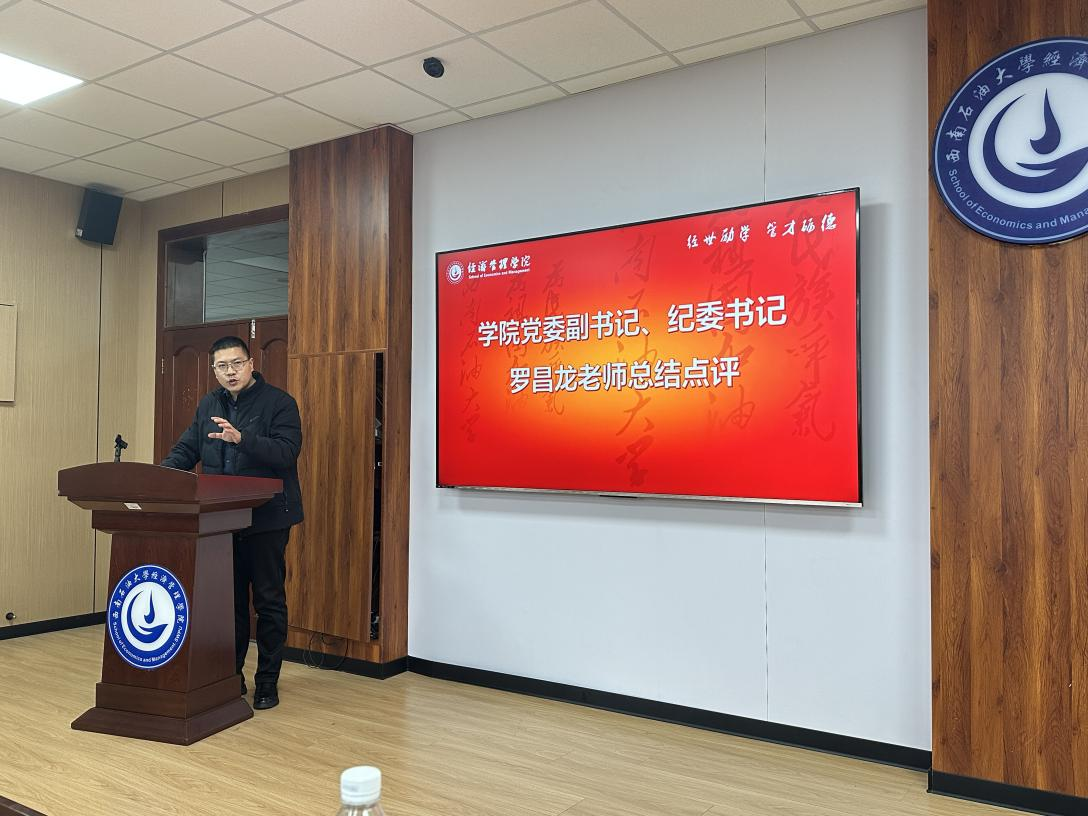 学院党委副书记、纪委书记罗昌龙对比赛进行总结点评,他肯定了选手们的积极态度和精彩表现,并勉励选手对舞台设计、语言表达、素材制作等方面进行针对性训练,并建议大家多结合自身实践感悟,用更鲜活的故事和更具张力的表达,让党的精神真正入脑入心。