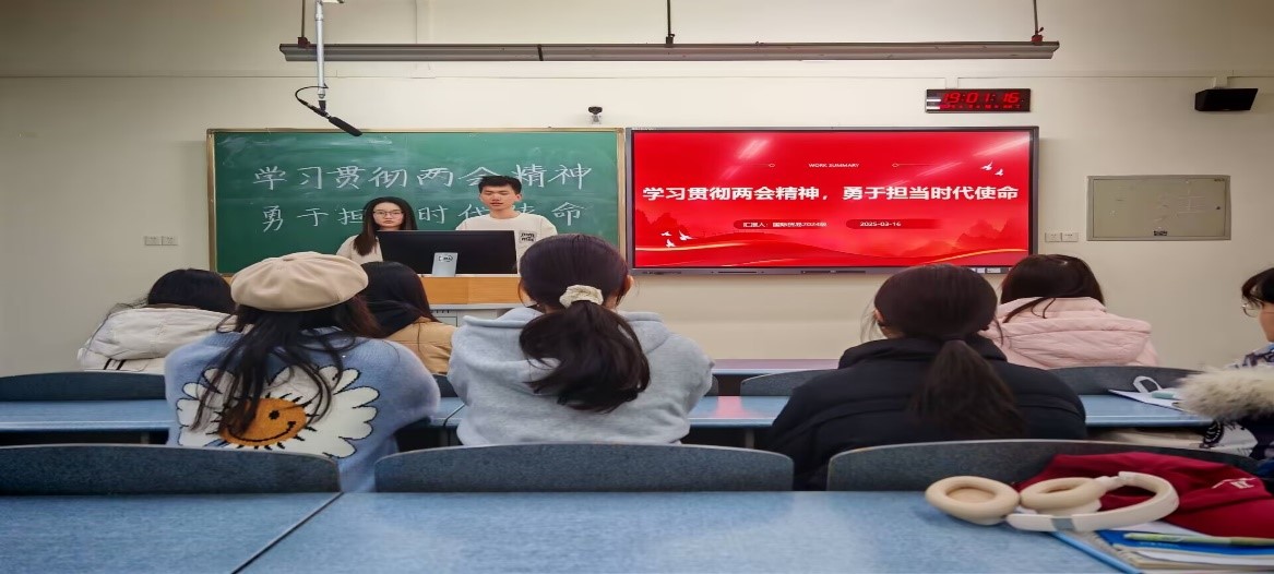 2025年3月16日晚,国际贸易2024级在博学楼B206教室成功举办了一场以“学习贯彻两会精神,勇于担当时代使命”为主题的班会活动。此次班会面向国际贸易2024级的同学,旨在通过多种形式的学习和交流,引导同学深入理解两会精神,明确新时代青年的历史使命与责任担当。本次班会由班长马犇、团支书余靖两位同学担任主持人。