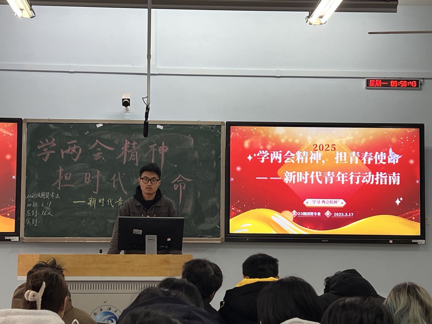 为深入学习贯彻2024年全国两会精神,引导青年学子厚植家国情怀、勇担时代使命,深化其对两会精神的理解,激发当代大学生奋进新征程的责任感与使命感,2023级国际经济与贸易专业于3月17日在博学楼A206组织开展了“学两会精神,担时代使命——新青年的行动指南”主题班会。班会由宣传委员米静文同学主持,全体学生参与。