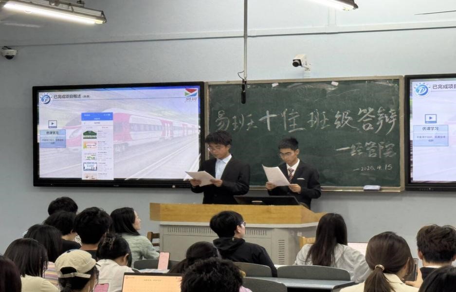 4月15日晚,国际经济与贸易2024级2班怀揣着对易班建设的热忱,站上经管院易班十佳班级答辩的舞台,展现属于国贸学子的建设成果和青春风采。答辩现场,答辩人王浩和付骏宇代表班级46位同学以“‘易’路同行,‘高’歌奋进”为题,“易班列车”为线索,从思想引领、学风建设、文体活动、多彩生活等多个维度,全面介绍了班级在易班平台上的建设成果。在思想引领方面,班级利用易班优课等媒介开展线上微党课,与团组织活动宣传相结合增强理想信念教育引导效果,向红色出发;学风建设中,班级依托易班搭建学习交流平台,分享学习经验,上传学习资源,进行晚自习打卡,形成了“比学赶帮超”的良好氛围,成果显著,为列车提速;文体活动方面,班级借助易班发起运动会分享助威、节日共享喜悦等活动,增强班级凝聚力,承载班级温度;多彩生活板块中,同学们通过易班分享生活点滴,从志愿活动等社会实践经历,到日常趣事小事,传递出2班大家庭的温暖与力量。