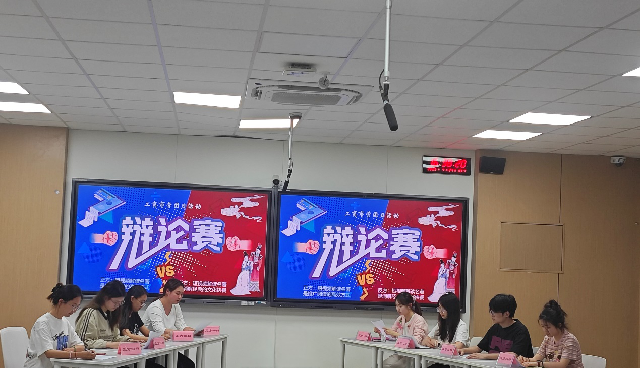辩论赛以"短视频解读名著是推广阅读的高效方式/消解经典的文化快餐"为辩题展开。正方一辩以"5分钟读完《红楼梦》"现象为切入点,指出短视频通过故事速览、人物关系图谱等创新形式,使经典突破时空限制,"让《平凡的世界》播放量突破2亿次,正是年轻群体重拾经典的证明"。反方一辩以某平台"黛玉职场生存指南"等魔改视频为例,强调"当宝黛爱情被简化为恋爱技巧,文学意蕴已荡然无存",现场观众同学频频颔首。