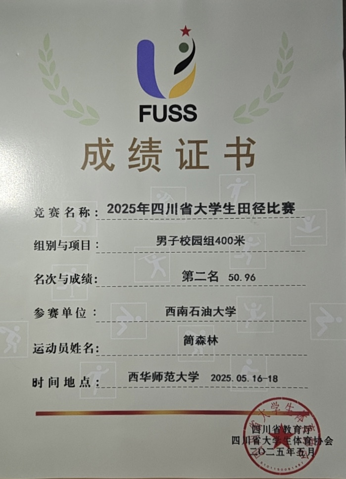 5月17日,在2025年四川省大学生田径比赛男子校园组400米决赛中,我院2023级经济学专业简森林以50.96秒的成绩夺得亚军,刷新了学校男子400米纪录。