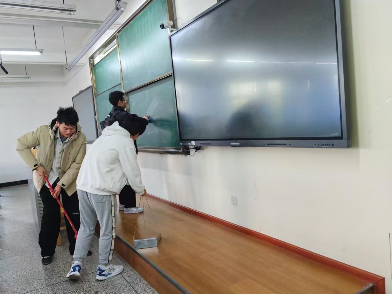 活动聚焦明辩楼C202-C204教室展开深度清洁。同学们分小组进行教室卫生打扫、黑板讲台清理、粉笔槽清理、课桌抽屉垃圾清理等劳动项目,劳动过程中,大家干劲十足,用消毒液仔细擦拭桌椅表面,弯腰清理地面顽固污渍,细致清理每一处角落。劳动间隙,同学间还分享打扫技巧,互帮互助提升效率,班委用相机记录下同学们专注劳动的精彩瞬间。