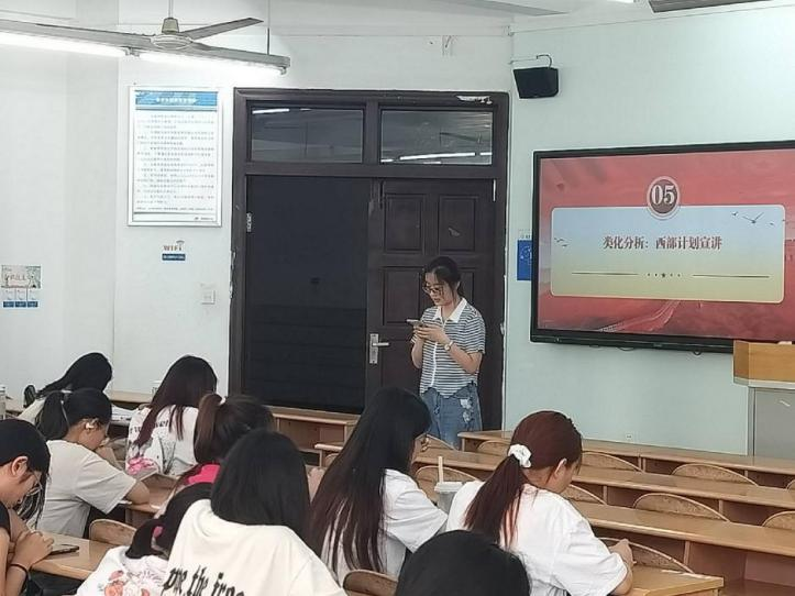 活动在激昂团歌声中启幕,全体成员以饱满热情唱响团歌,凝聚青春向党的信念。随后,支部成员观看《中国人物——希望点灯人中国支教者》等励志视频,支教教师扎根基层、青年奋斗者投身一线的事迹,让大家深刻理解“到祖国和人民最需要的地方”的内涵,坚定将个人理想融入家国发展的决心。支部成员代表结合感悟上台演讲,贯彻“人人都讲三分钟”,呼吁青年胸怀“国之大者”,主动到基层、边疆淬炼成长。活动最后开展西部计划宣讲,解读招募政策,鼓励同学们在磨砺中增长才干,用实际行动诠释青春的担当。