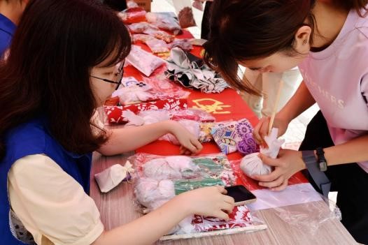 “彩线轻缠红玉臂,小符斜挂绿云鬟。”活动开始前,负责人向志愿者们介绍了端午节佩戴香包的习俗起源与文化寓意,讲解了制作香包所需的材料(艾草、薄荷等中药材,彩色布料、针线等)及制作步骤。随后,志愿者们分组领取材料,纷纷动手制作,在劳动中感受传统手工艺的温度。活动现场,志愿者们围坐于红布铺就的长桌旁,指尖在绣着缠枝莲纹的彩布间穿梭,竹筛里的艾草、薄荷与藿香碎叶沙沙作响,氤氲出《荆楚岁时记》里“端午以艾为虎形,或剪彩为小虎,帖以艾叶”的古意。裁剪布料、填充香料、缝制封口……大家相互交流技巧,现场气氛热烈。经过大家的努力,一个个造型精美、香气四溢的香包陆续完成。活动尾声的“香包寄相思”环节,同学们在洒金笺上书写《离骚》名句作祝福——“纫秋兰以为佩”的诗句随着艾草香一同封入锦袋。