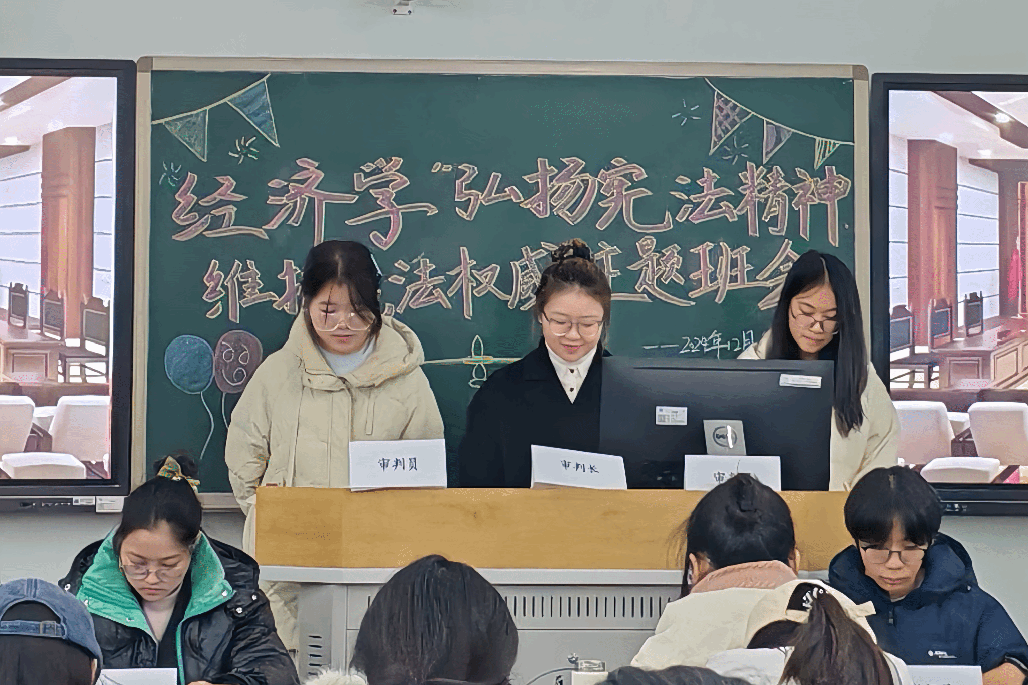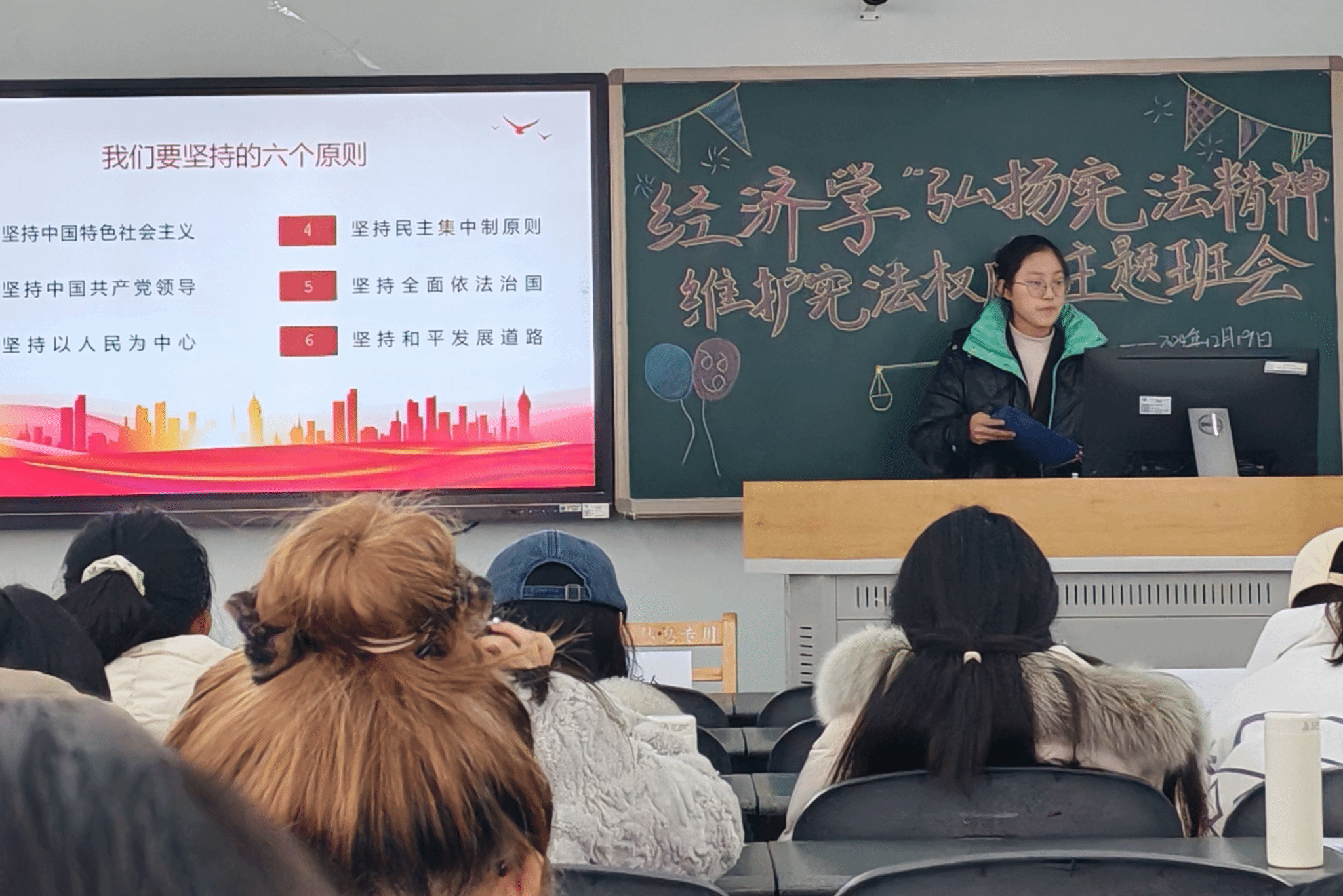 12月19日,经济管理学院2024级经济学专业在思学楼A311教室举行了一场以“弘扬宪法精神,维护宪法权威”为主题的班会活动。此次班会旨在增强同学们的宪法意识,促进对宪法精神的深入理解和践行。班会由一名主持人精心策划并主持,活动内容丰富,形式多样,吸引了全班同学积极参与。