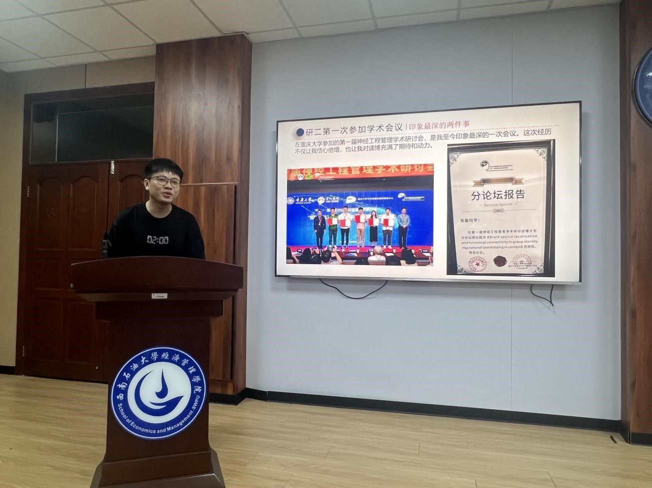 本次分享会荣幸邀请到了两位在科研与竞赛领域表现尤为卓越的研究生,他们分别是:专注于神经管理学领域的经济管理学院石油与工程管理博士研究生青鑫;来自经济管理学院,在学生工作于学科竞赛领域有着丰富经验的硕士研究生李睿昊。两位主讲嘉宾以故事为舟、以经验为帆,“言为心声,行为世范”,为在校学子树立了可学可敬的榜样。