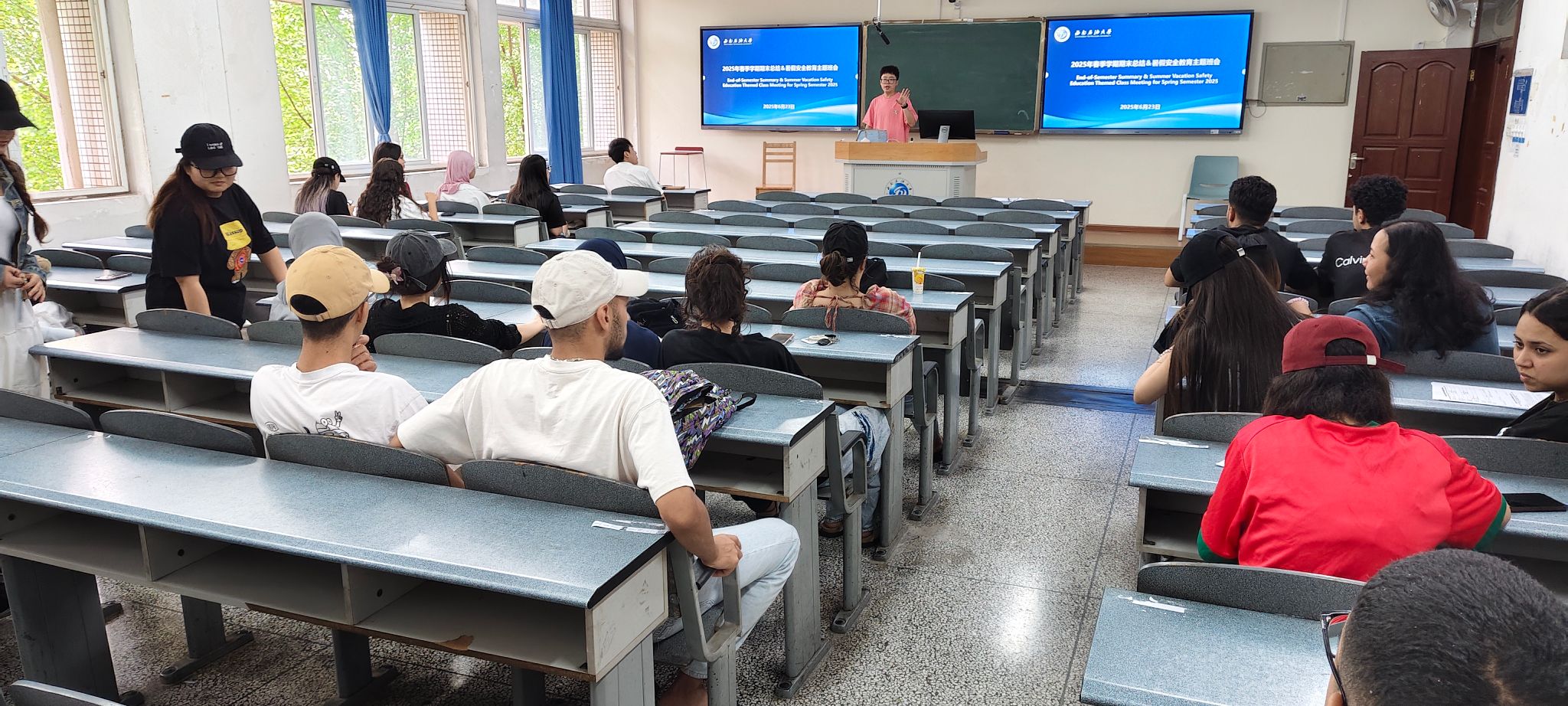 为保障国际学生安全,做好学期工作交接,经济管理学院于2025年6月23日于博学楼B303教室召开2025年春季学期期末主题班会。前任辅导员李晨、新任辅导员王紫及兼职辅导员曾兆旭与全体国际学生齐聚一堂,共话安全与发展。