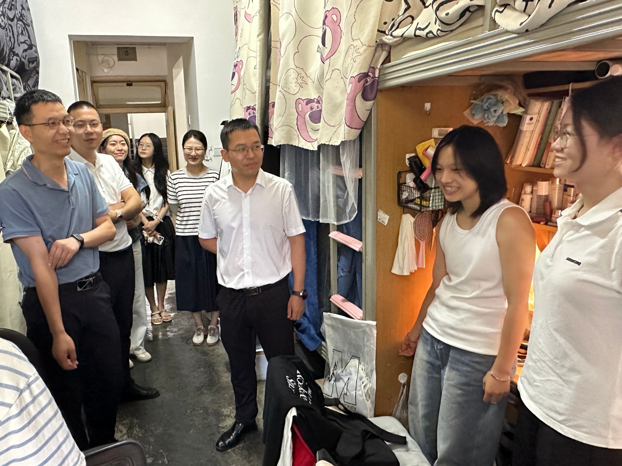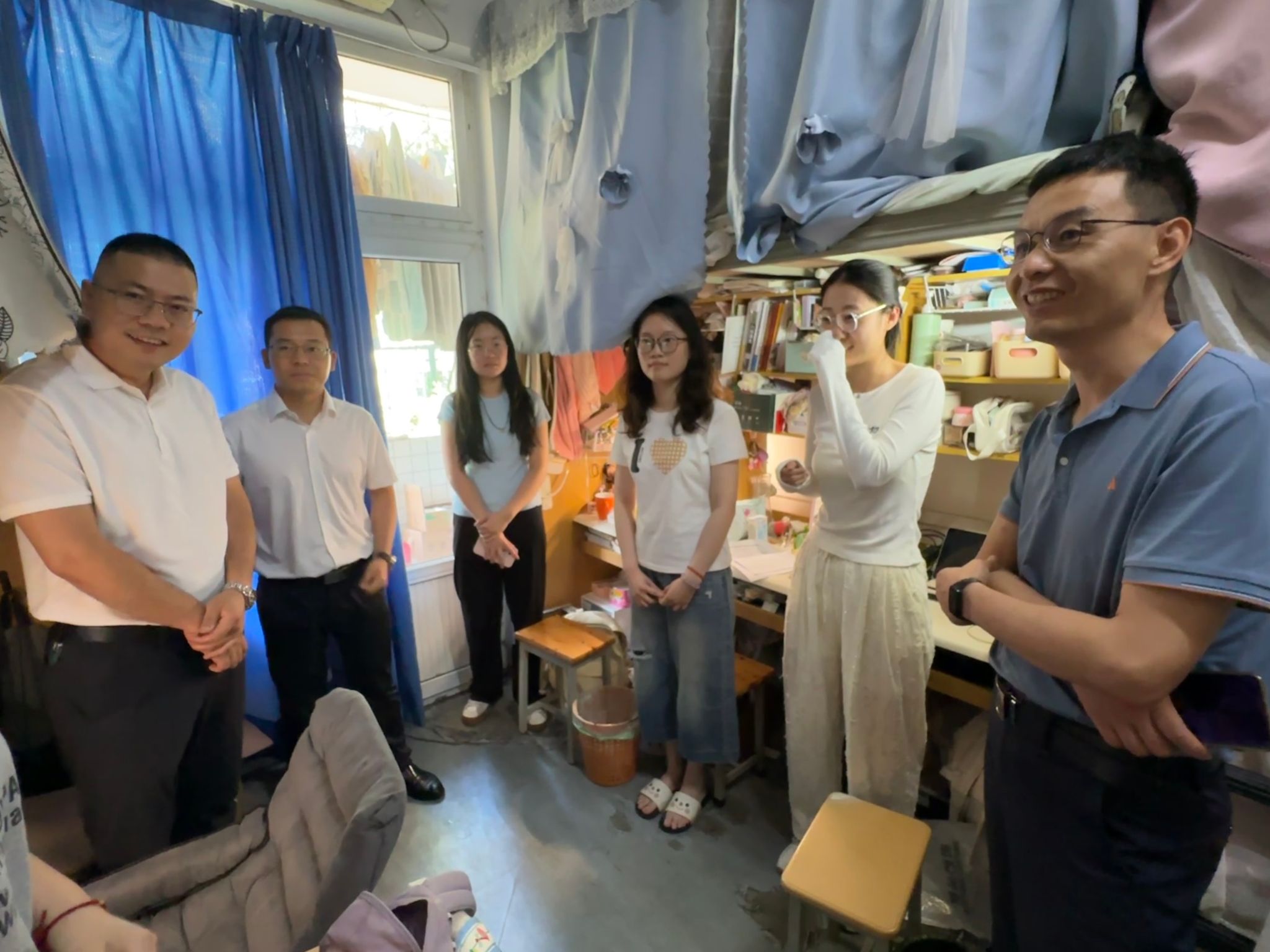 走访过程中,学院领导与学生展开交流,针对大三年级学生,询问考研复习进度、实习单位落实等情况,倾听学生在备考和求职中遇到的问题。曾有为表示,应合理规划暑期复习时间,保持良好心态,遇到困难及时与老师们沟通;郑小强叮嘱准备实习的学生,实习是积累实践经验的重要途径,需注重学习与自身安全。同时,学院领导一行对宿舍基础设施、卫生状况及用电安全进行检查,肯定了大家良好的生活习惯,强调要增强安全防范意识,做到人走断电,不使用违规电器,共同维护宿舍安全。
