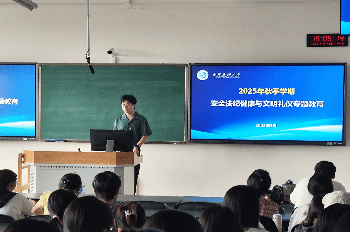 在文明礼仪教育环节,王子昀深入剖析了校园交往中的常见矛盾。王子昀指出,文明不仅是个人修养的体现,更是维护集体和谐的基础,并提出“文明三原则”:尊重他人边界、控制自身行为、主动沟通化解。王子昀特别强调:“安全是底线,法纪是准绳,文明是修养。希望同学们以规范约束行为,以素养提升竞争力,为未来职业发展筑牢根基。”