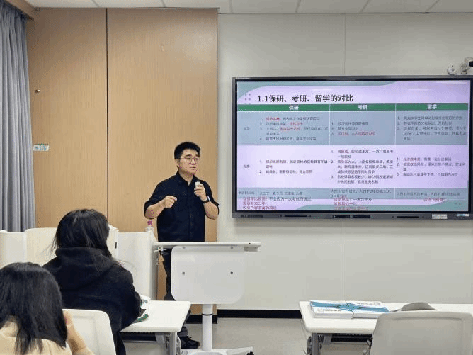 活动邀请了“考研吧”机构导师兰雁翔老师为我校学生讲解保研经验。兰老师首先向我们介绍了保研,考研与留学对我们发展的不同影响。随后,兰老师用数个生动的案例讲述保研的全流程。让同学们更全面的了解保研之路。除此之外,他深度解读我校保研政策,并向我们给出具体提升方案。