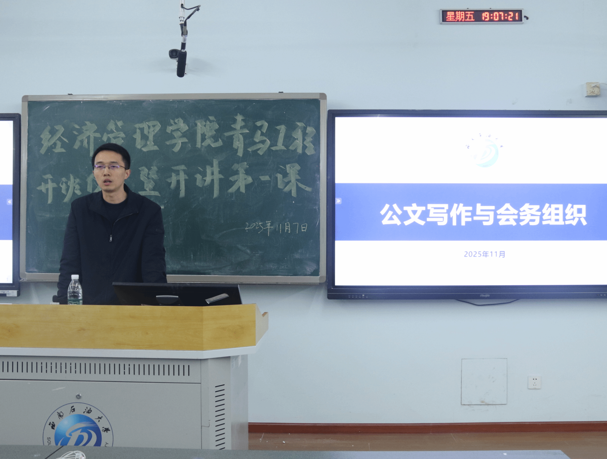 开班仪式结束后,青马工程第一课正式开讲。党政办秘书四科科长蒋勇老师以“公文写作与会务组织”为主题,结合西南石油大学专题会议公文实例,从公文概念、公文种类、材料撰写、会务组织四个方面系统讲解。蒋勇老师通过典型案例剖析、实用技巧分享,深入浅出引导学员掌握公文写作的核心要领。讲解会务组织时,蒋勇老师结合本次开班仪式提出改进建议,为大家讲授突发情况应对要点,以鲜活案例深化理解、积累经验。学员们认真记录、积极互动。