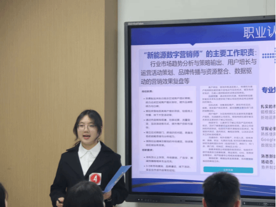 在主题陈述环节,选手们围绕自我认知、职业环境分析、目标岗位匹配度、实施路径等方面进行现场展演。评委提问环节中,评委们从行业趋势、岗位能力、实践路径等角度出发,与选手展开深入交流,并提出中肯建议。