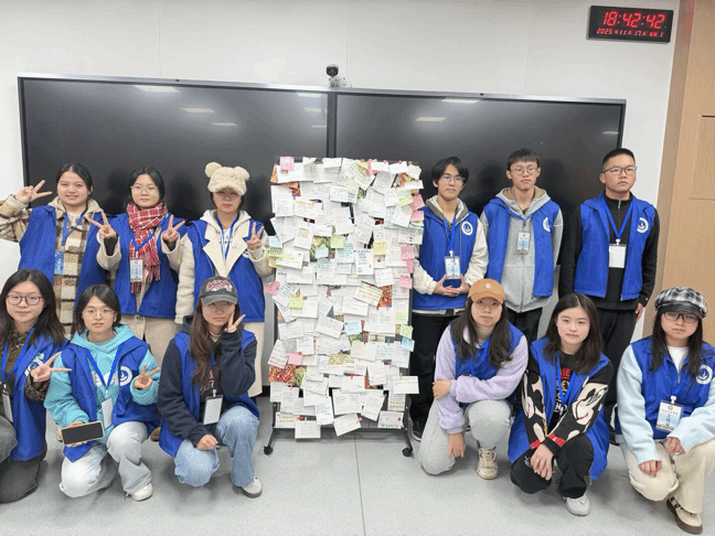 活动现场,参与学生在统一配发的主题明信片上,写下对“三下乡”实践活动的感悟与展望,或为乡村儿童留下鼓励与祝福。完成书写后,同学们将明信片亲手布置于教室展示板,形成一片集中的“寄语墙”。这些明信片将由2026年暑期“三下乡”社会实践团队统一带往实践地,送达山区孩子们的手中。
