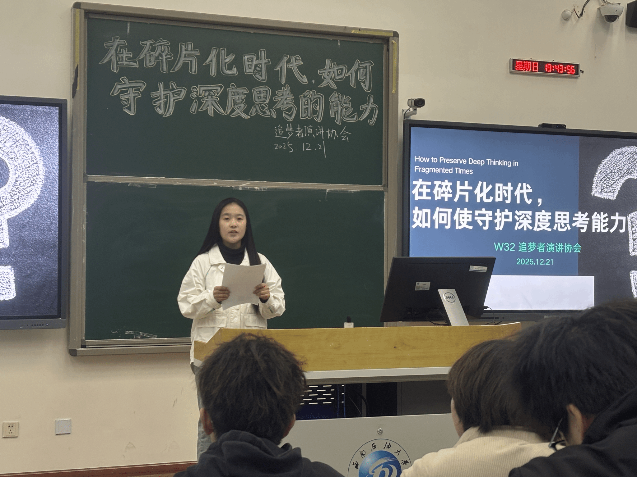 12月19日,由追梦者演讲协会主办、经管院社团联指导的“碎片化时代,如何守护深度思考的能力”线下演讲比赛在思学楼B110温情启幕。众多热爱思考、乐于表达的“小柚子”齐聚一堂,以语言为媒,共探对抗信息洪流的良方,在思想碰撞中重拾沉潜之力。