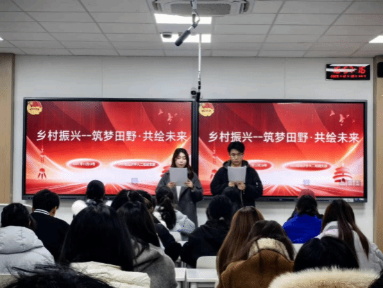 12月18日,为引导青年学子深入理解乡村振兴战略,发扬发扬奉献精神和承担时代责任,经济管理学院2025级经济学2班团支部围绕“乡村振兴·筑梦田野·共绘未来”主题在博学楼B101教室举办了一场内容深刻的主题团日活动。班级全体成员参加,由贾小瑶、王智勇担任本次主题团课的主持人。
