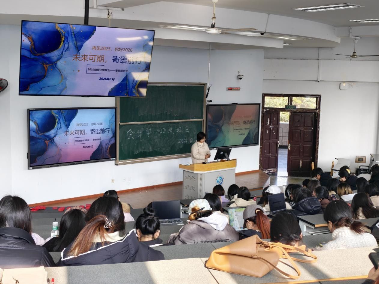 为进一步明确期末及毕业前关键任务,助力同学们平稳衔接人生新阶段,1月8日下午,2022级会计学专业期末主题班会在思学楼C210教室顺利召开。本次班会由辅导员陈宏霞主持,全体2022级会计学专业同学参会。