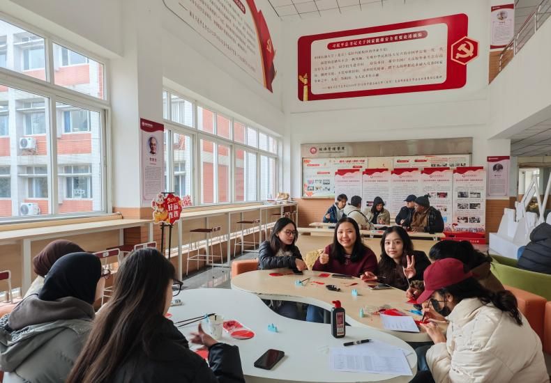 近日,我院于博学楼3楼大厅精心组织了一场温馨且富有文化韵味的慰问活动,学院留校国际学生热情参与。活动现场,国际生辅导员王紫先介绍了剪窗花、写春联等传统习俗的内涵。随后,国际学生们纷纷拿起剪刀和红纸,在老师指导下剪出形态各异的窗花,又手持毛笔,蘸墨挥毫,书写出饱含祝福的春联。现场热闹非凡,节日氛围浓厚。