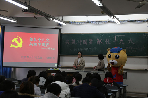 为了组织同学们学习贯彻党的十九大会议精神,12月14日下午,经济学2016级支部在博学楼B203开展了以“献礼十九大,共筑中国梦”为主题的班会。班会由宣传委员冯文静主持,班级全体同学参加本次班会。