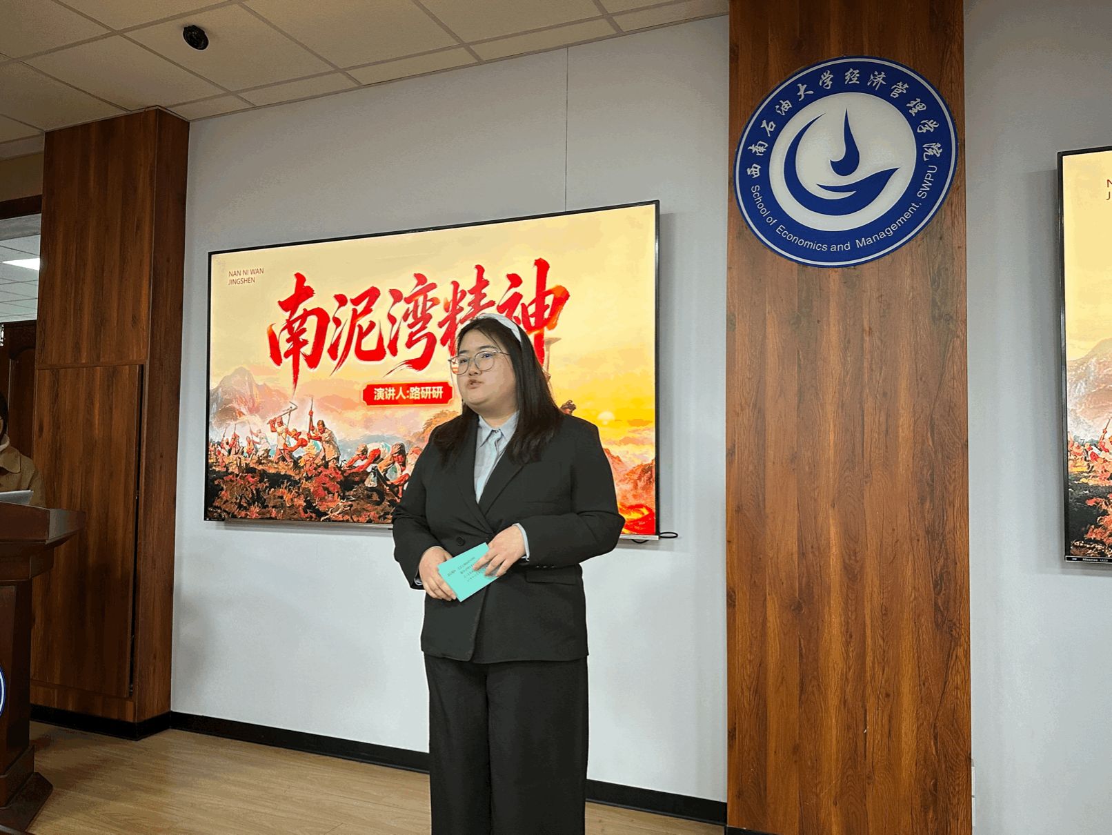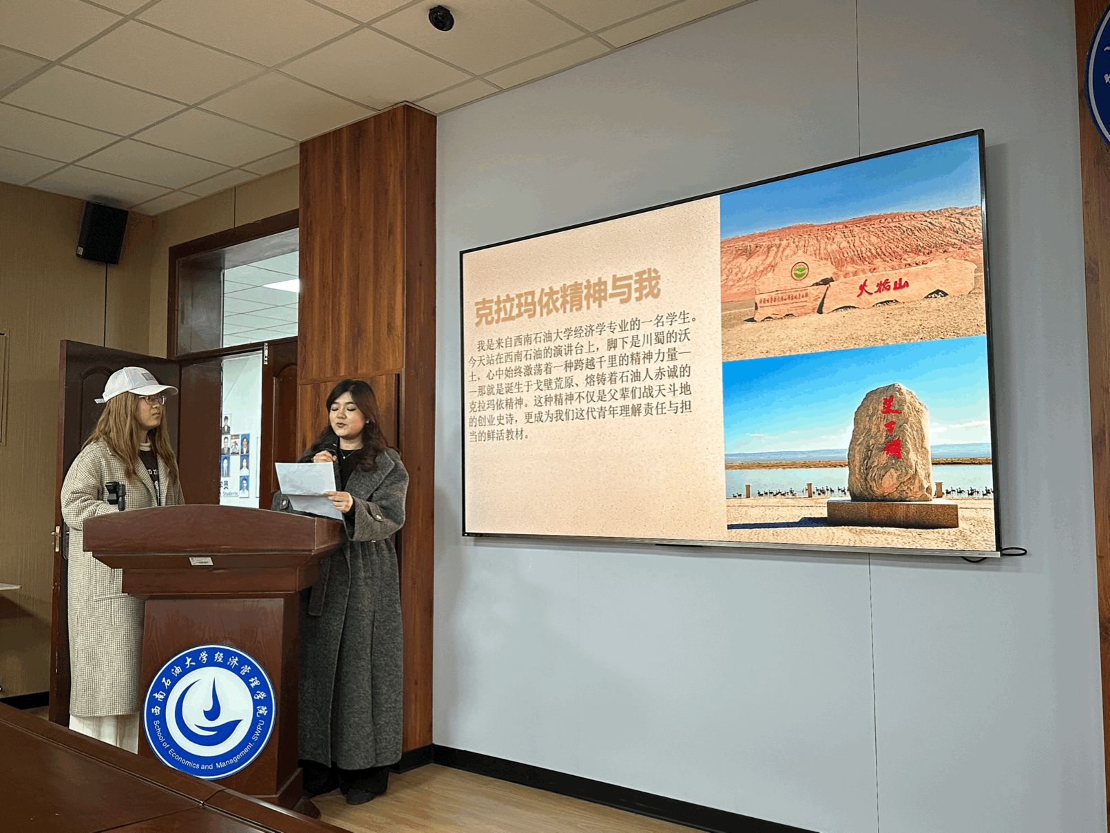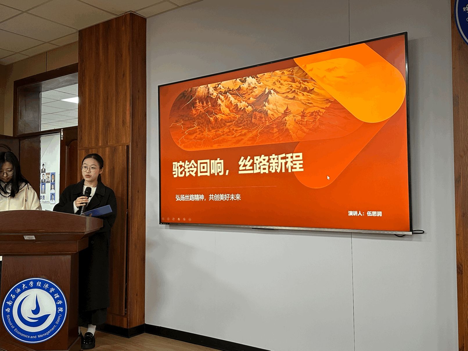 在演讲比赛中,六位同学以生动的演讲,展现了中国共产党百年奋斗历程中铸就的伟大精神。来自新疆吐鲁番的凯迪日耶·斯来曼同学,从经济学视角对“克拉玛依精神”进行解读,让观众真切感悟到石油人的精神力量。路研研同学回顾那段艰苦奋斗的时期,讲述“南泥湾精神”。罗诗怡小组以“老西藏精神”为主题,展现了建设者们在极端环境下的坚韧与奉献。文子翼重温井冈山精神,探寻其在新时代的传承与实践。伍思润小组从历史与现代的交汇点切入,讲述“丝路精神”在当代的意义。最后,周宣霓同学以“航天精神”为题,引领观众领略了中国航天事业的辉煌成就。