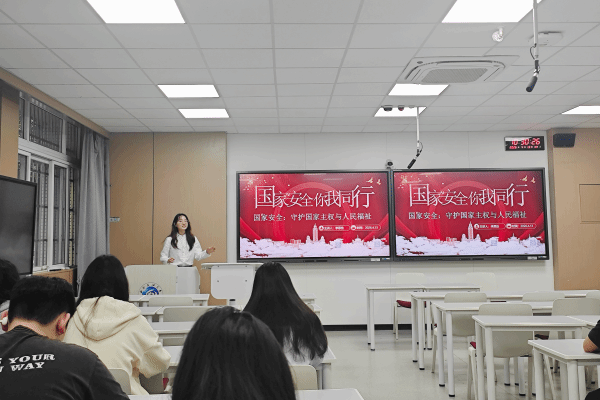 本次团组织活动围绕总体国家安全观核心内涵,对政治、军事、经济、社会四大安全领域进行全面阐释与深入解读。她结合大学生参与 “帮信罪”、非法倒卖证件、个人信息泄露等真实典型案例开展警示教育,提醒同学们要提高风险防范能力,自觉守护个人信息和财产安全,并普及相关国家安全举报平台和渠道,引导大家在发现危害国家安全行为时主动举报、及时制止。现场同学们也积极参与互动、交流心得,活动最后共同观看国家安全宣传视频,深化对总体国家安全观的理解和认识。