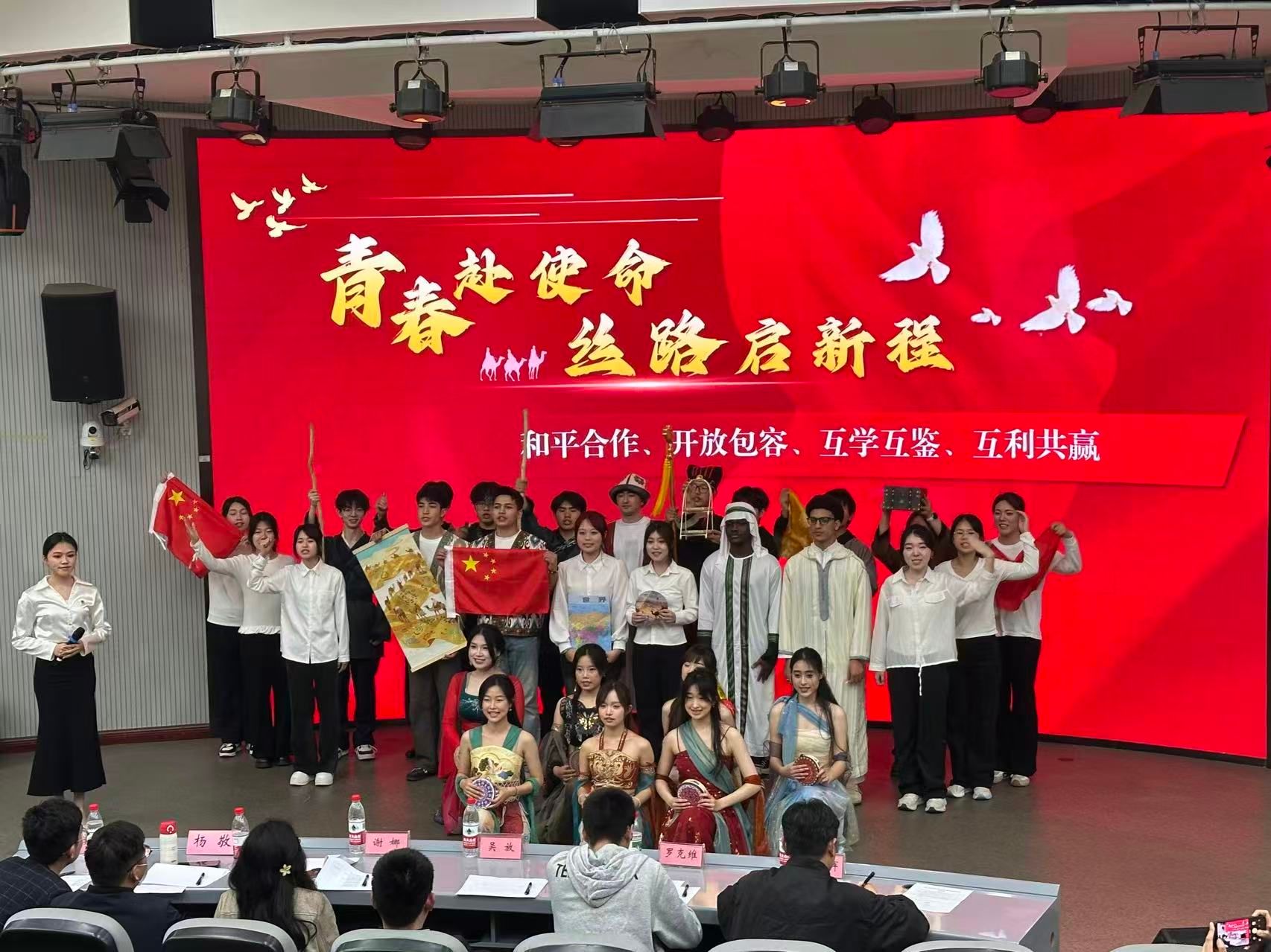 本次参赛作品《千年之约》采用情景演绎、师生对话、民族舞蹈等多元形式,分三大篇章全景呈现丝路文明的传承与新生。展演现场,我院学子精神饱满、配合默契,汉族学生、新疆籍学生与留学生同台演绎,用真挚情感与鲜活表演,将千年丝路的历史底蕴与新时代青年的使命担当完美融合。