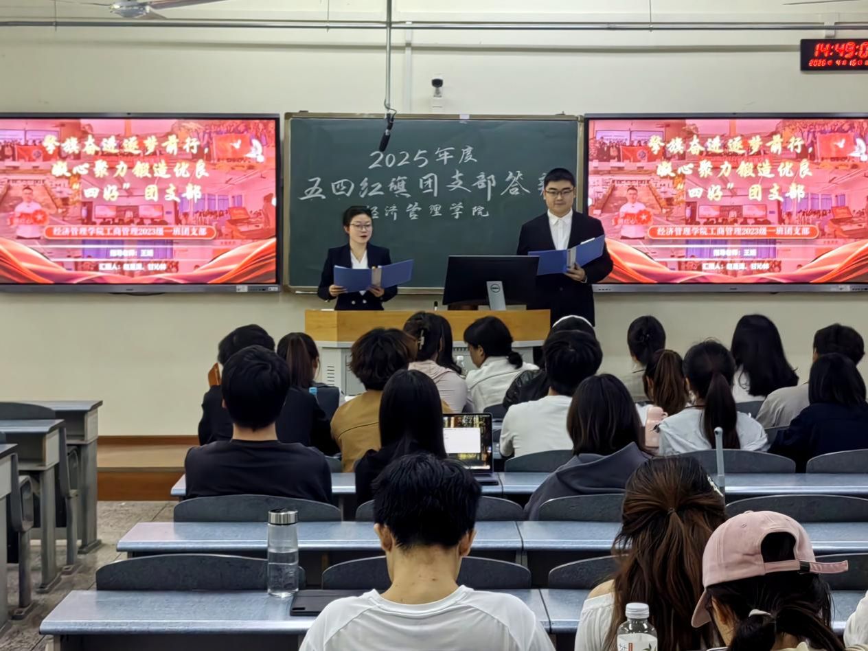 为进一步夯实基层团组织建设,深入贯彻落实习近平总书记关于青年工作的重要思想,充分发挥“五四红旗团支部”的先进典型示范引领作用,4月16日下午,我院在博学楼B303顺利举办2025年度“五四红旗团支部”评选答辩活动。来自工商管理、会计学、经济学、国际经济与贸易等专业的多个优秀团支部同台展示。