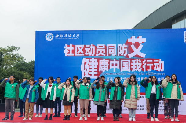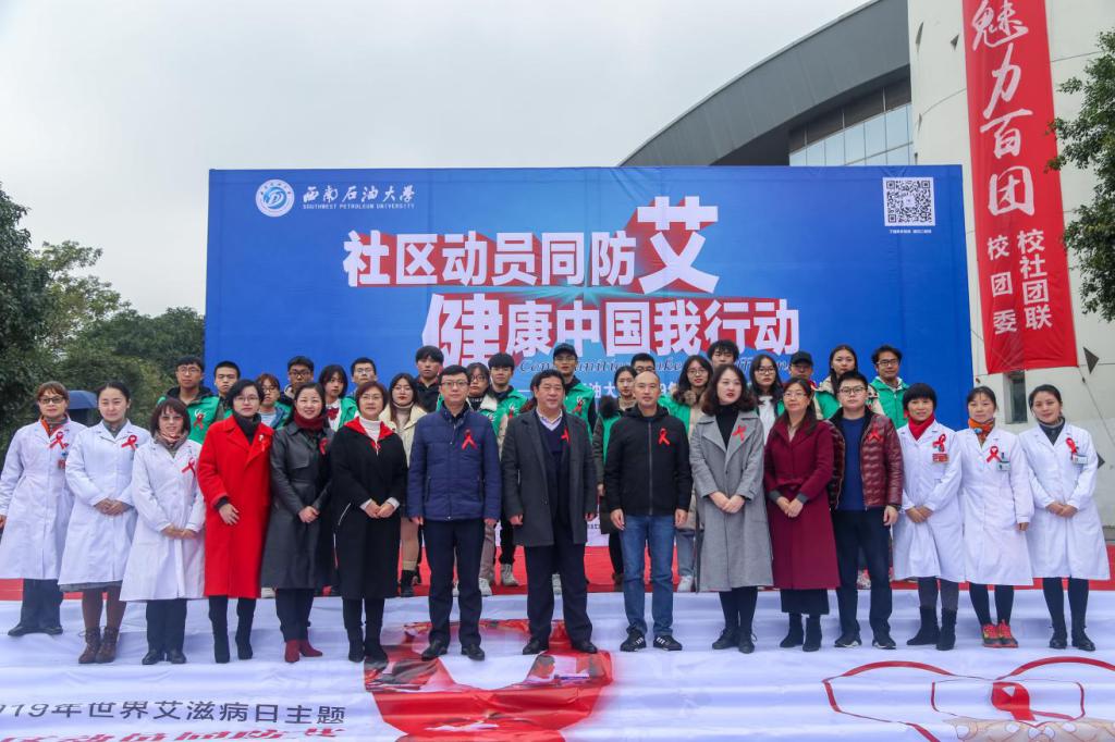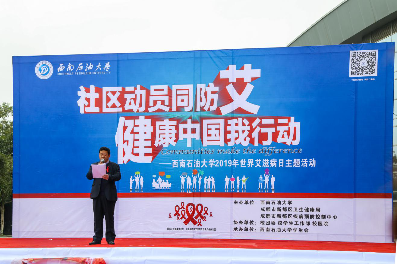 11月 28日下午,“社区动员同防艾,健康中国我行动”艾滋病日主题宣传教育活动在博学广场举行。副校长巫晓兵、省教育厅体卫艺处调研员卢旭、成都市新都区卫生健康局副调研员彭仕江、校团委书记夏艳、保卫处处长邓洪波、学生工作部副部长陈俐红、新都区疾控中心副主任黄智芬、校医院直属党支部书记游丽、校医院院长张继红、新都区疾控中心重大传染病防治科科长梁海东出席活动,全校400余名青年学生参加了本次活动。