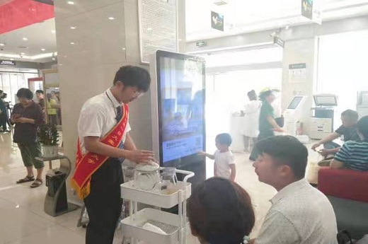 志愿者们有的引导客户办理业务,有的为不熟悉操作机器的客户进行银行智能服务的操作,有的为客户提供基础业务的咨询,还有志愿者为等待办理业务的人提供一杯暖心的茶水。在工作过程中,志愿者们始终保持者自身的积极与热心,用自己的一颗最真诚的心对待着每一位前来银行的客户。