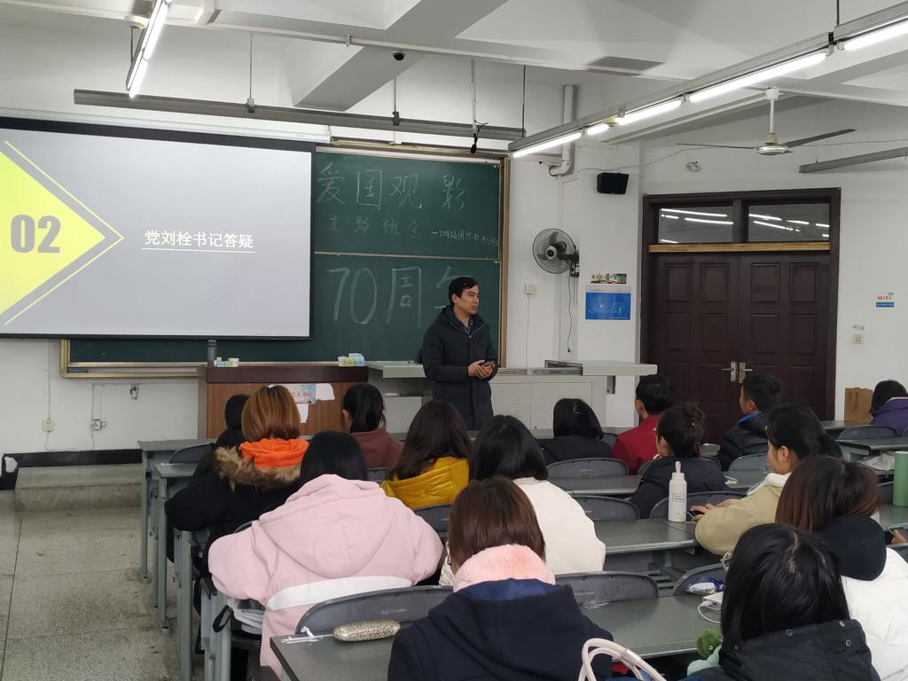 12月18日上午,我院国际经济与贸易专业2018级在思学楼A416举行了爱国观影主题班会暨师生座谈会,辅导员周士越主持会议,班级联系领导学院党委书记党刘栓到会与同学们进行座谈、交流。