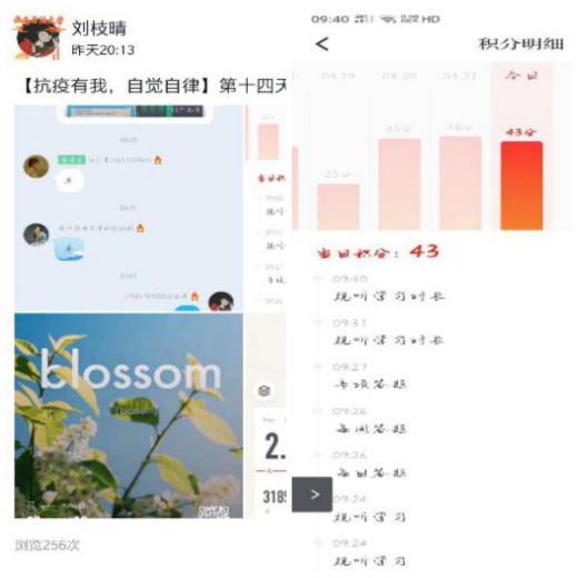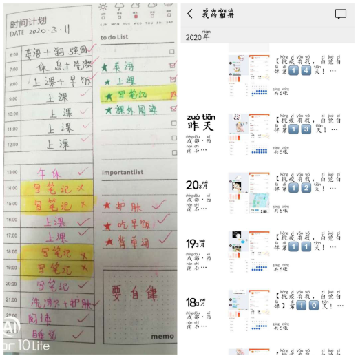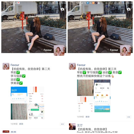 19级工商管理类专业的刘枝晴在已是预备党员的学长学姐的邀请下,积极加入到经管院21天打卡挑战活动中。在打卡期间,她每天定时开启三十分钟的英语词汇训练和二十分钟的健身训练,从未间断的打卡分享不仅带给她小小的成就感,更是感染了朋友圈的一个又一个人。作为一名刚刚开启大学生活半年的大学生,刘枝晴表示刚刚适应从高中到大学的改变,也要对专业课的深入学习做好准备。面对这份转变,她决定要努力调整心态,适应自己的新角色,线下自律学习,充实自己生活,提升个人能力,积极为返校做准备。刘枝晴感慨道:“大一上学期,我对自己的大学生活充满着迷惑与怀疑,自律能力作为自己的薄弱之处有时正需要这种外力的帮助,在学长学姐的每日监督帮助下,我感受到我一直不是一个人在学习,学院还有很多人和我一样,无论是在校还是在家,我们虽年级不同、专业不同,但通过此次打卡挑战,我们互相监督互相学习,共同处理问题,我们都在向着自己的目标努力着,这次打卡让我找回了积极的状态,也让我慢慢从被动走向主动。”