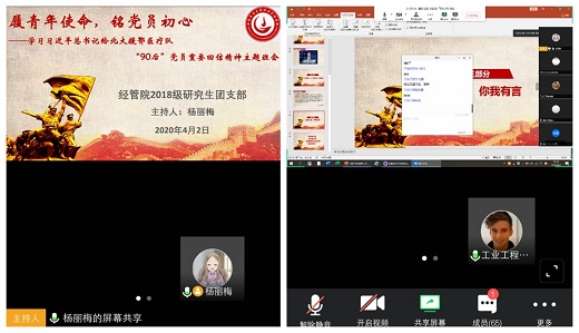 4月2日上午10点30分,经济管理学院2018级研究生团支部召开了关于“习近平总书记给北京大学援鄂医疗队全体‘90后’党员的重要回信精神”的线上学习主题班会,此次活动由经济管理学院2018级研究生团支部书记杨丽梅主持,经济管理学院2018级全体研究生参与了此次会议。