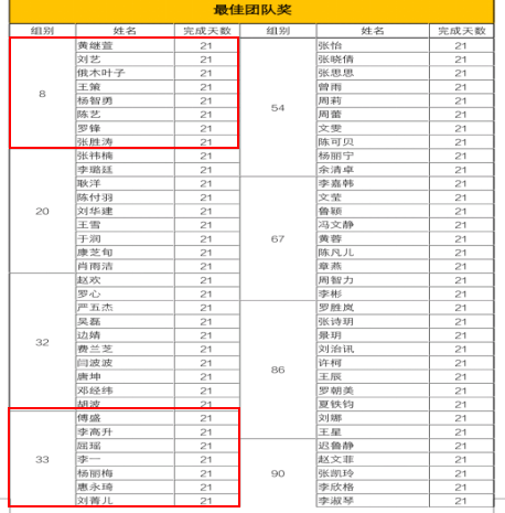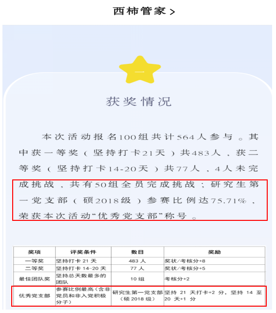 在我支部党员、入党积极分子的带领下,共有56名同学参与21天挑战活动。其中党员同志17人,入党积极分子17人,群众22人,参与人数达班级人数的80%,共组建11个小组,其中党员小组7个,入党积极分子小组4个。在支部的相互监督和共同努力下,支部在本次活动中,52人获得一等奖,3人获得二等奖,2个小组获得最佳团队奖,我支部更以80%的参与率荣获“优秀党支部”称号。这不仅充分展现了本支部党员与入党积极分子的模范带头作用,更为学生党员带动一批人、影响一批人树立了榜样。
