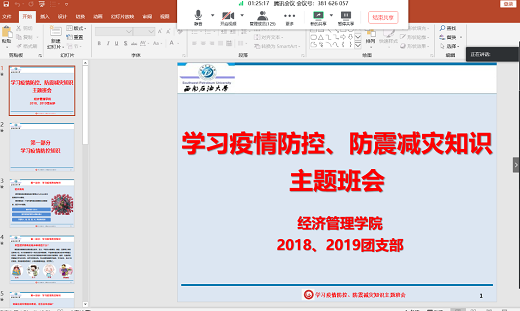 2020年5月14日上午10点整,经济管理学院2018、2019级研究生团支部召开了“学习疫情防控、防震减灾知识”的主题班会,本次主题班会由2018级研究生团支部书记杨丽梅主持,经济管理学院2018、2019级全体研究生参与了本次会议。