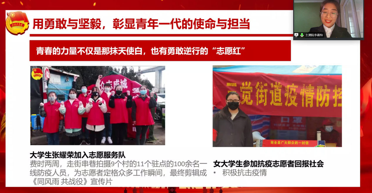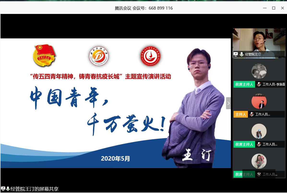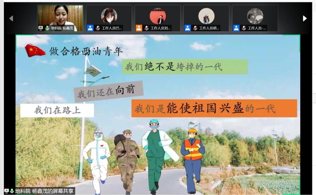 来自土测院的李嘉怡和经管院的王汀分别以“我们在路上”和“中国青年,千万萤火”为题目,讲述了此次疫情中青年一代们如何用实际行动为疫情做出自己的贡献,或奋战在一线,或志愿于后方,真正凸显了新时代青年的勇敢与坚毅;化工院的朱家莹与理学院的滑雪航则介绍了五四运动的起源和发展,他们表示“爱国,进步,民主,科学”的精神必将在一代代青年的努力中得到传承和弘扬,中华民族伟大复兴的中国梦终将在一代代青年的努力中变为现实;地科院的杨茂鑫、体育院的张雅婷分别以自身和志愿者为例,向大家展示了疫情中石大学子的不畏艰险,勇担责任。艺术团的阮振洲、石工院的李浩男和机电院的郑宇阳的演讲掷地有声,他们向广大青年学子呼吁:“青春易逝,韶华难在,当代青年,要做有辩识力的青年,要做不惧逆水行舟,只知坚定前行的青年!”;计科院院的陈嘉洋和外语院的臧小峰从我校学子角度,阐述了明德、笃志,博学、创新的石大魂和“为祖国加油,为民族争气”的石大精神。