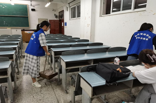 活动开始前,负责人迟羽宁安排志愿者进行签到和领取马甲,并根据安排表将志愿者划分为多个小组,以小组合作的形式开展教室清洁活动。