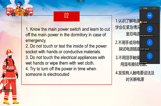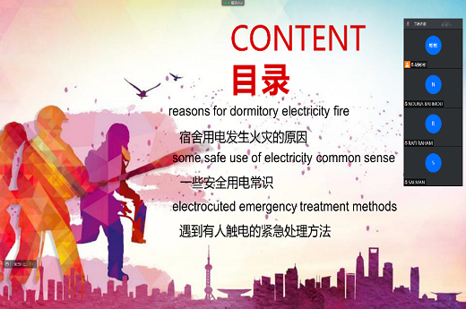 现代生活中,电力的使用在生活中已无处不再,相应的,如何安全用电也是校园安全中需要十分关注的问题。主讲人首先讲述了近年发生的寝室用电不规范所导致的事故,提醒大家寝室规范用电的重要性;其次对一些用电常识进行了介绍,如清楚寝室总电源开关位置,不能湿手触摸电器,不能在寝室随意更改电路等;最后对发生寝室用电危险时应如何进行应急处理进行了讲解。让留学生对安全用电有清晰规范的认知,避免危险用电情况的发生。