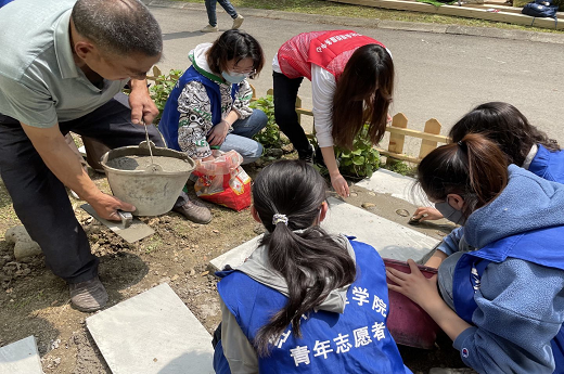 活动开始前,负责人带领同学们熟悉了相关工具,并且详细讲解了活动的流程与注意事项。同学们在专业人士的指导下铺设石板路、安装小栅栏并摆放了花盆,在新建的水泥小道上还留下了属于自己的手印,最后大家在社区书记的带领下一起去参观了退休教职工的活动室,现场气氛融洽,同学们在交流中受益匪浅。