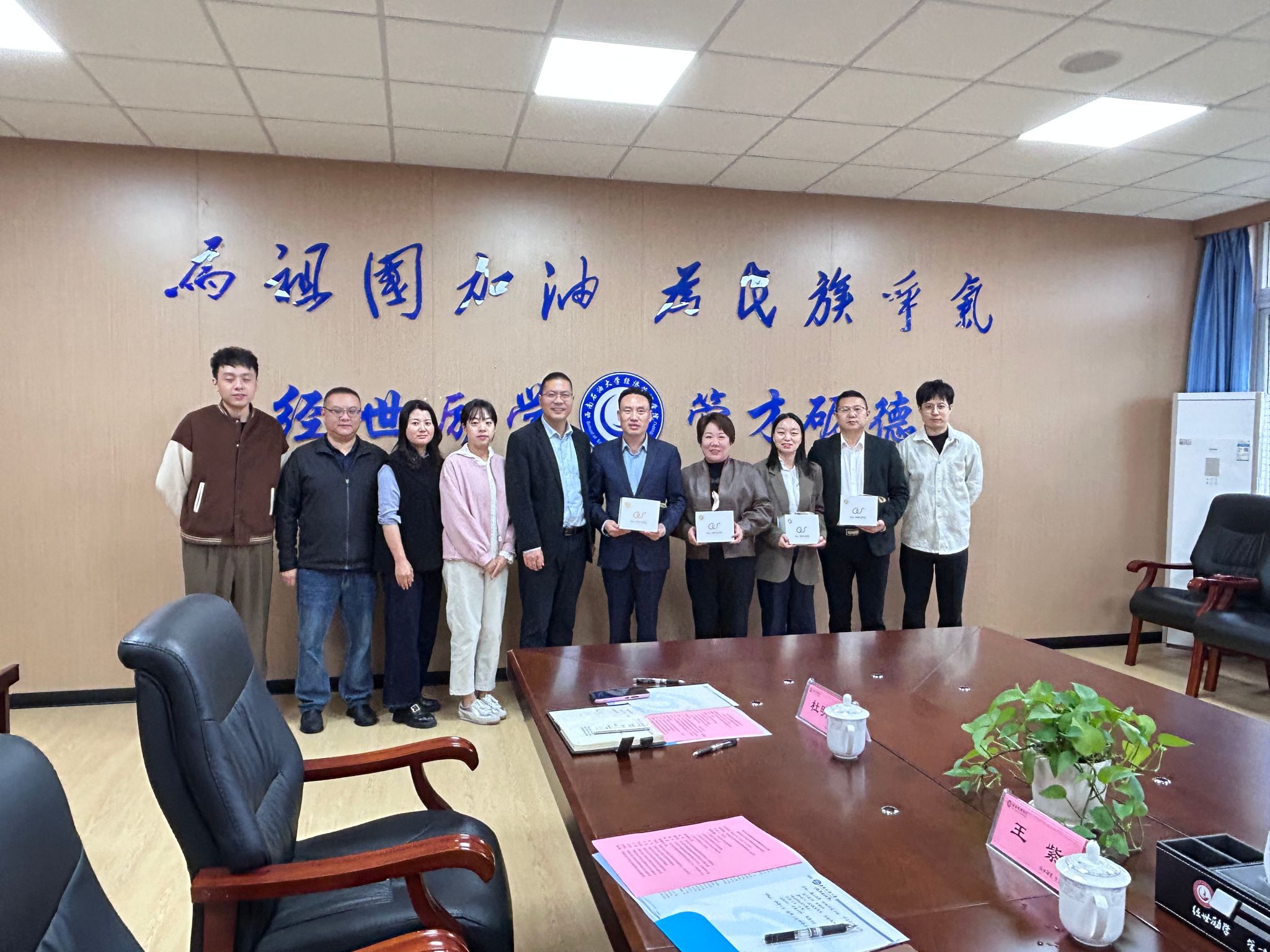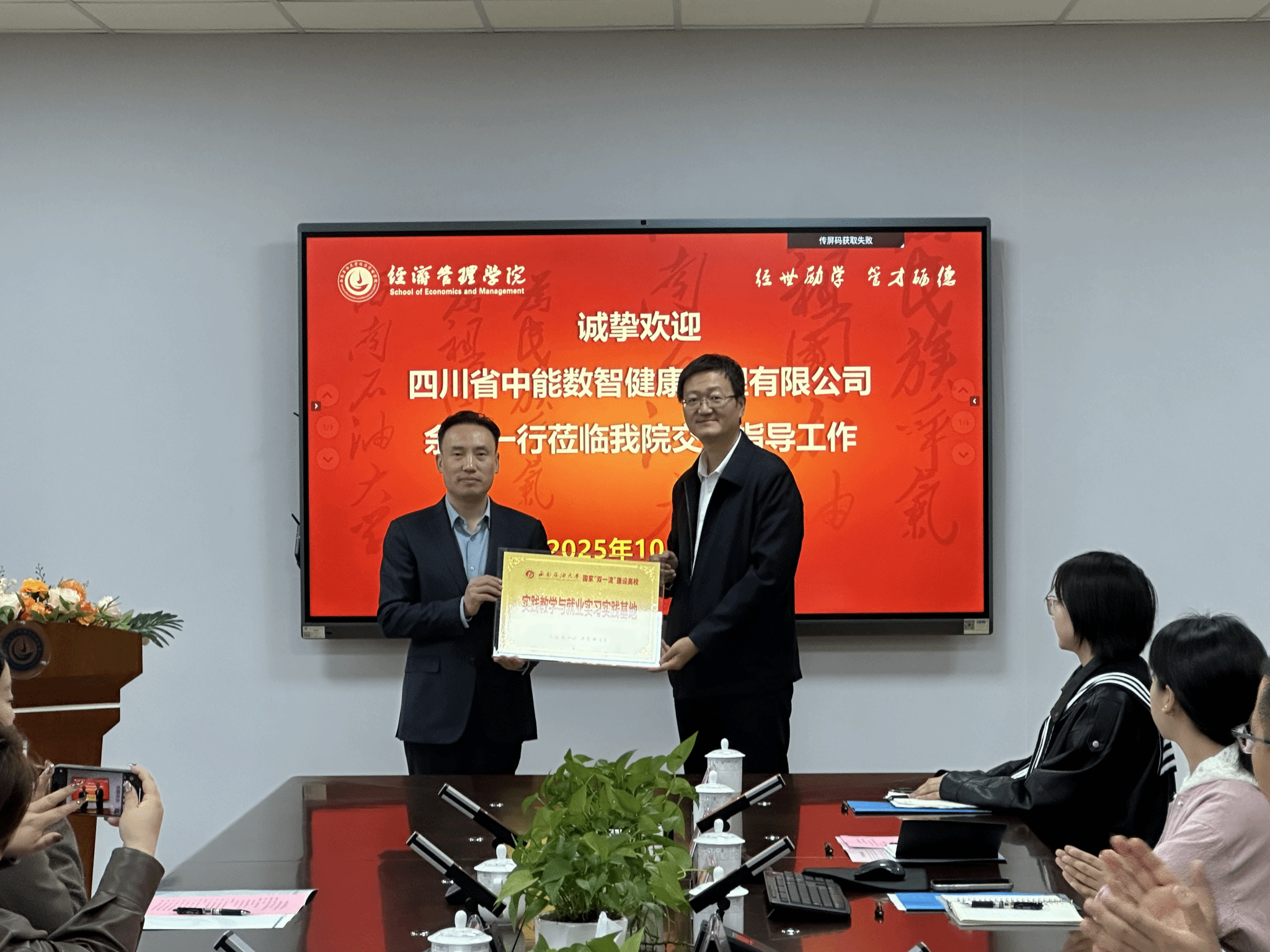 副院长苏昊从学科专业、师资队伍、科学研究、人才培养、社会服务等方面介绍经济管理学院情况。罗昌龙汇报了2026届毕业生基本情况。苏昊向余刚授牌实习实训基地,罗昌龙与余刚共同签署校企合作协议书。