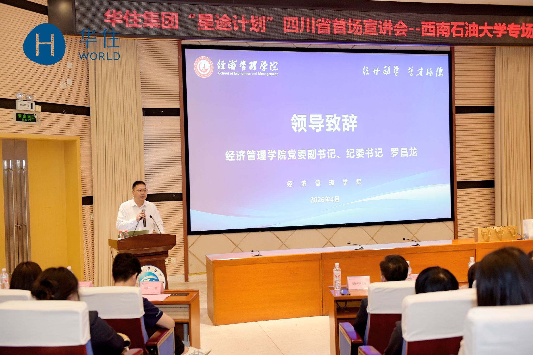 罗昌龙在致辞中对华住集团一行表示热烈欢迎与感谢,介绍了学院在人才培养、学科建设及就业工作方面的举措与成效,并积极推介学院学子。他表示,希望以此次宣讲为契机,进一步深化校企合作,为学生搭建更优质的实践与就业平台。