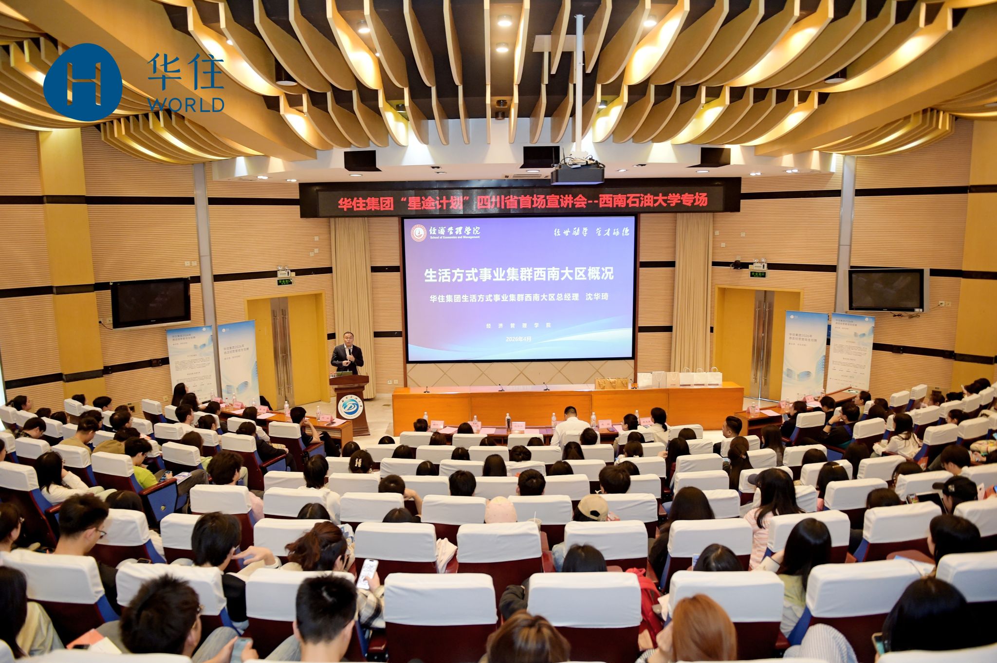 随后,华住集团多位代表依次展开分享。西南公司成都省区运营官薛文骞女士介绍了集团发展历程及国民、国中酒店品牌概况;华住集团精选服务事业部资深总经理王杰恒先生分享了精选服务事业集群的运营特色;生活方式事业集群西南大区总经理沈华琦先生结合自身从管培生成长为大区总经理的经历,生动讲述了职业发展路径。组织人才中心区域校企合作负责人刘浩先生对“星途计划”管培生项目的培养体系、轮岗机制、晋升通道、薪资福利及六险一金等作了详细解读。