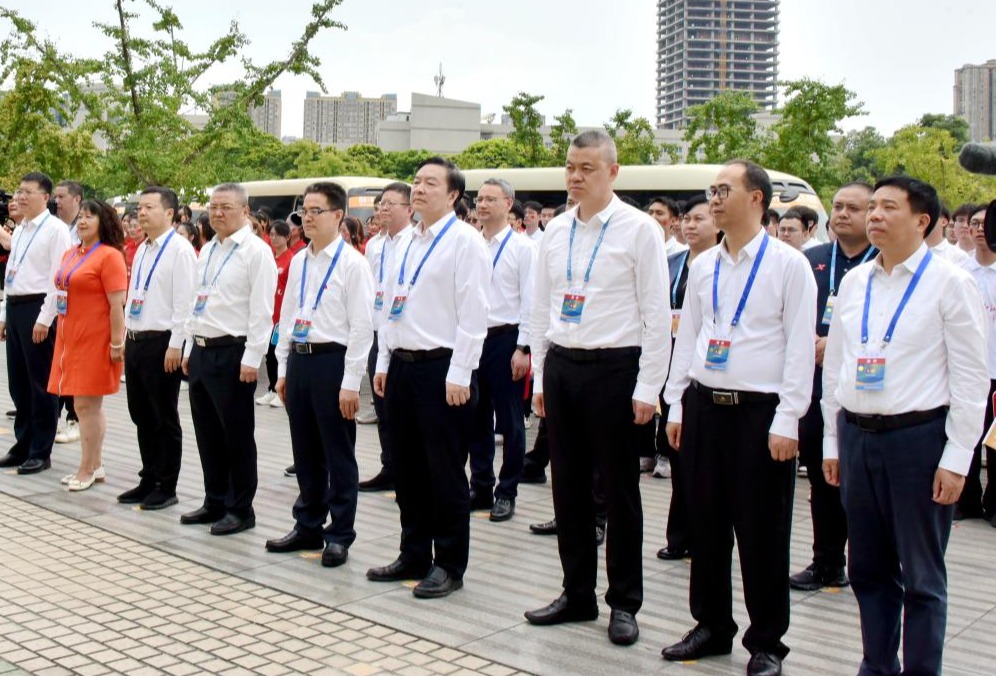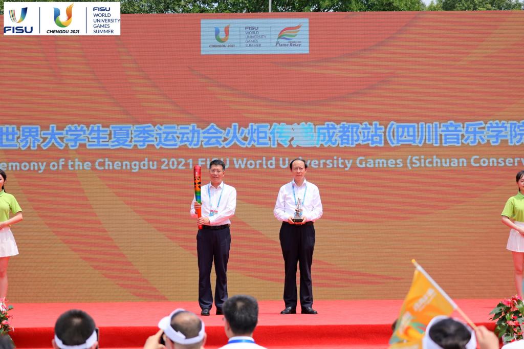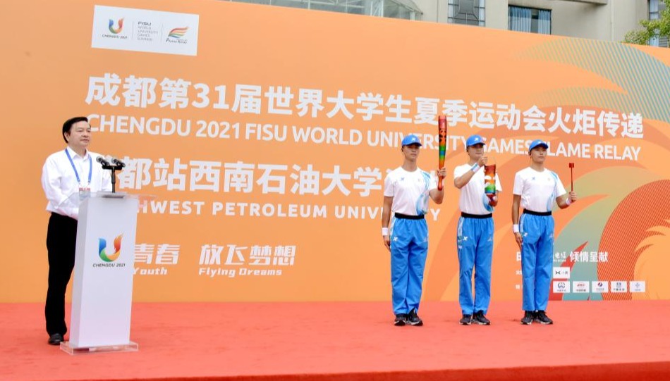 陈永灿邀请火种护卫队点燃大运会火炬“蓉火”,宣布大运会成都站(西南石油大学)火炬传递开始。