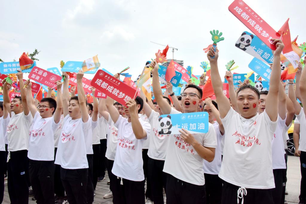 在成都大运会火炬传递主题曲《我们都是追梦人》和我校2023年招生宣传片原创主题曲《能源有你》的歌声中,成都第31届世界大学生夏季运动会火炬传递成都站(西南石油大学)起跑仪式在创业广场拉开帷幕。