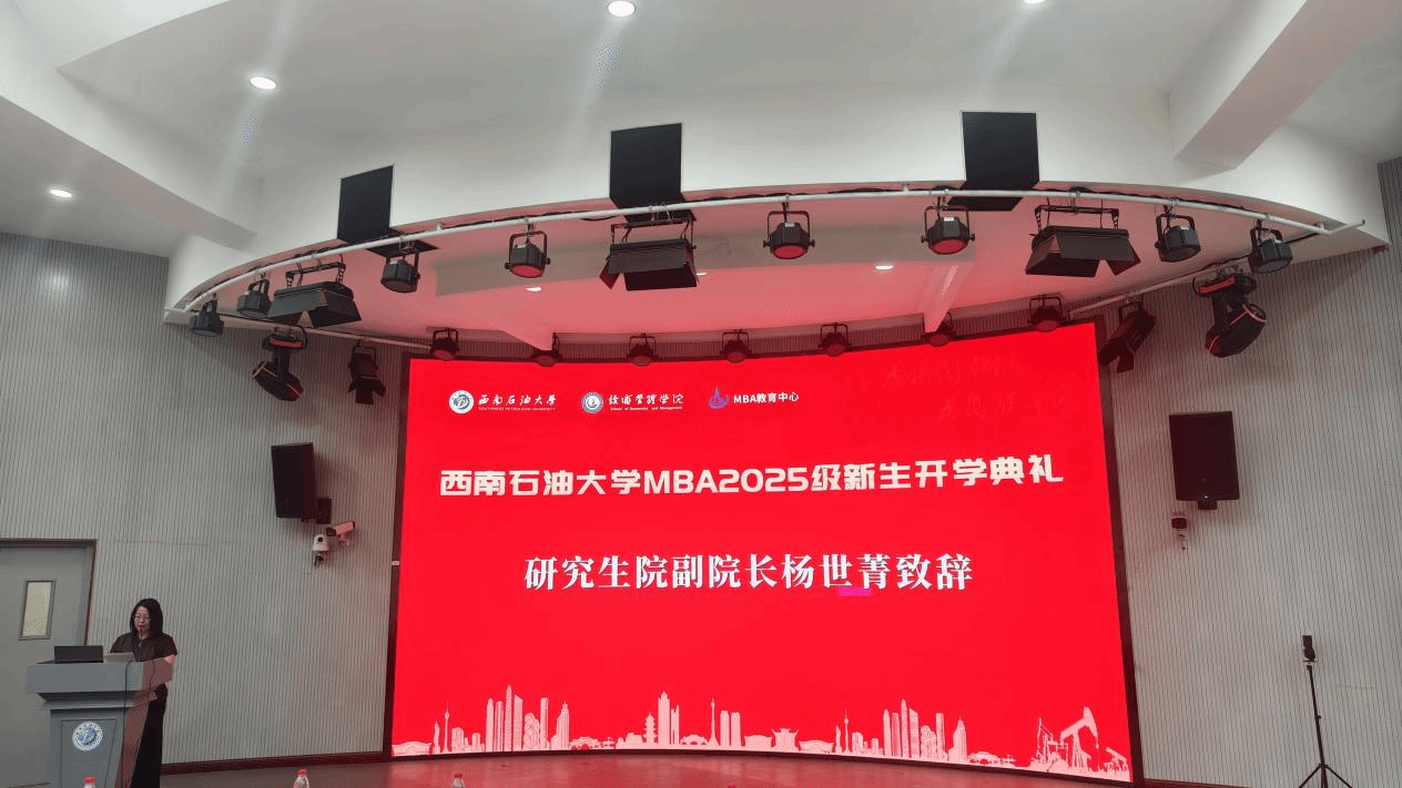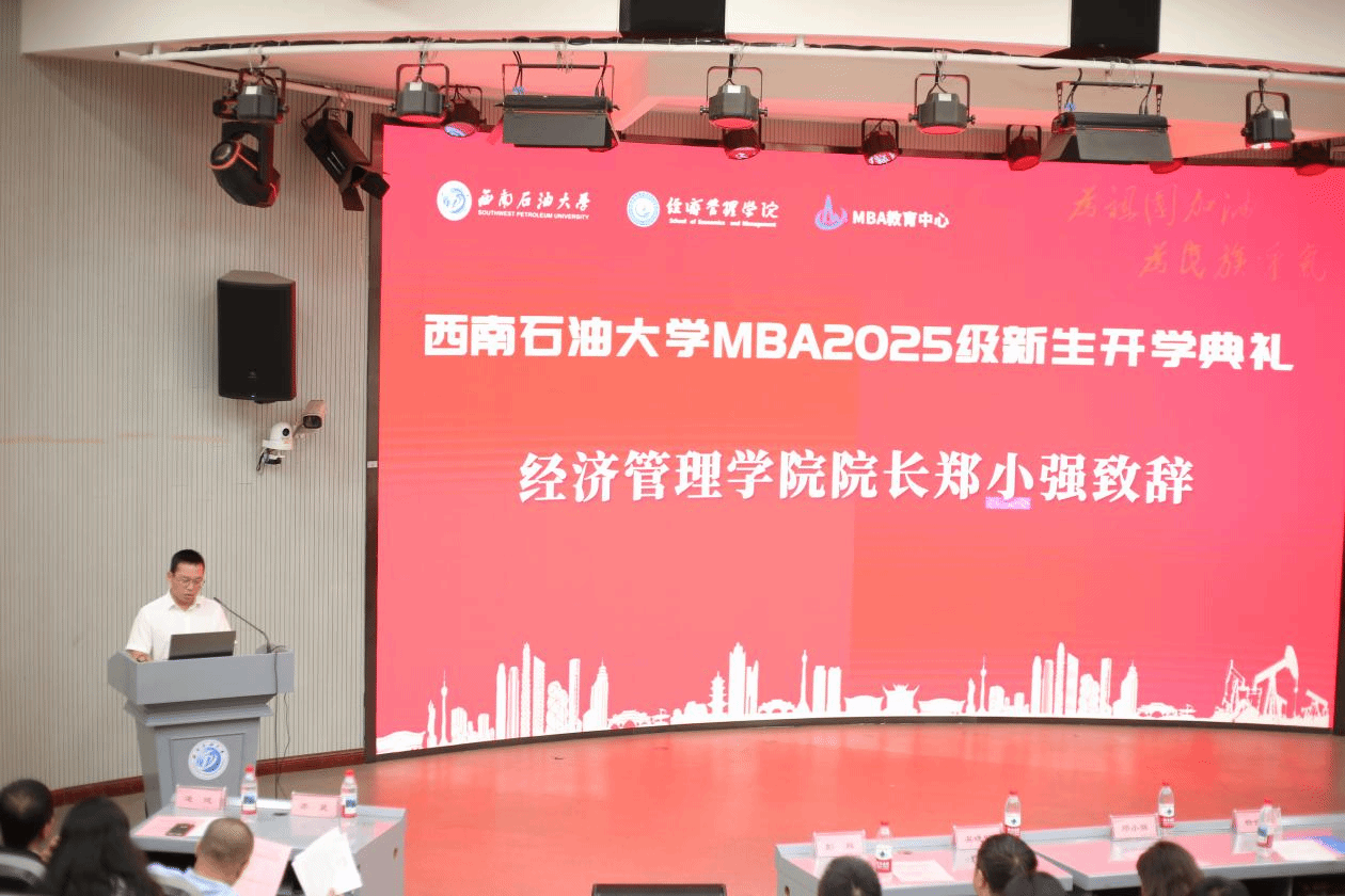 2025年9月6日下午,西南石油大学MBA2025级新生开学典礼在思学楼C110报告厅举行。研究生院副院长杨世箐,经济管理学院党委书记曾有为,院长郑小强,党委副书记、纪委书记罗昌龙,副院长吴晓明、郭志钢、彭双,MBA教育中心办公室全体教师及2025级全体MBA新生共同参加了本次活动,开学典礼由副院长苏昊主持。