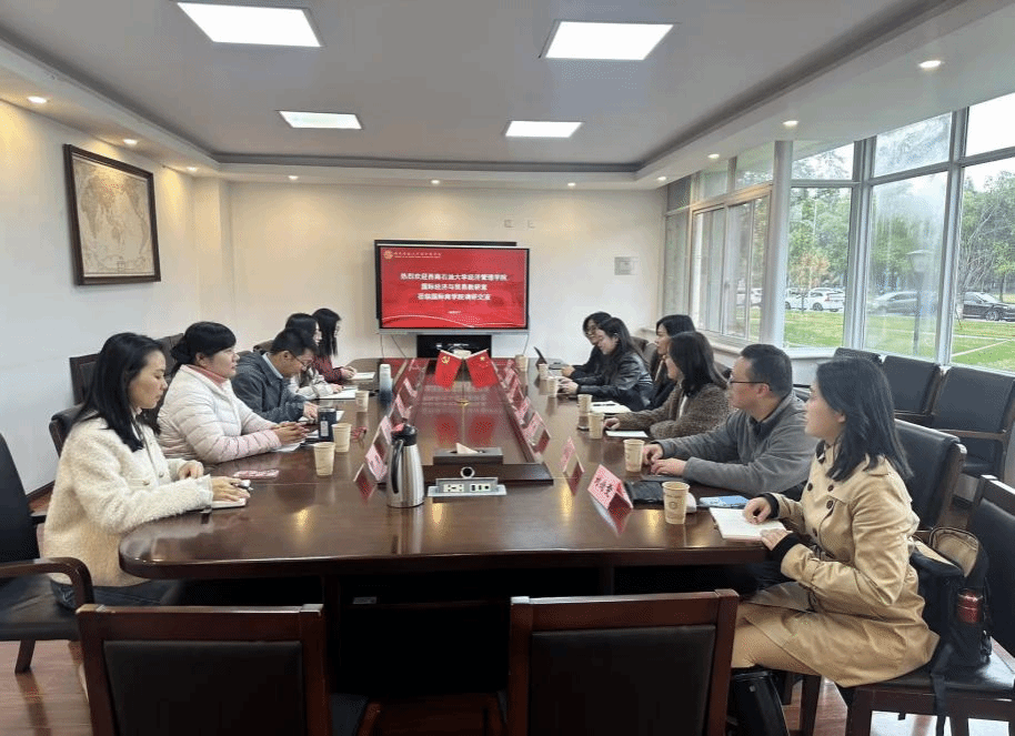 为进一步加强专业与学科建设,我院国际经济与贸易教研室全体教师于11月4日到西南财经大学国际商学院进调研学习,与西南财经大学国际商学院院长助理邓富华教授、国际商务系主任向姝婷、教工第一党支部纪委委员蒋海曦、本科教学办公室主任游路、研究生教学秘书罗静等教师进行了一场深入探讨和交流。