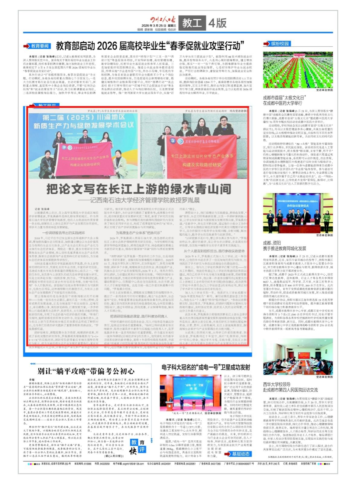 近日,《四川工人日报》对我院九三学社社员、教授罗胤晨的事迹进行了报道。罗胤晨的人生轨迹始终贯穿着一条主线:破解长江上游生态保护与产业发展的协同密码,用学术力量为西部绿色发展赋能。他以近十年的坚守,将学术论文写在祖国西部的绿水青山间,以实际行动诠释了一名高校教育工作者和民主党派成员的责任与担当。
