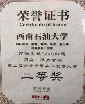 近日,“用友·华为云杯”第二届企业云服务开发者大赛暨新道商业创新大赛总决赛在线上举行,由我院学生詹芸、陈妍、马洋、戚世千组成的“小白杨”队以第二名的成绩获得全国二等奖。会计教研室庞敏担任团队指导老师。