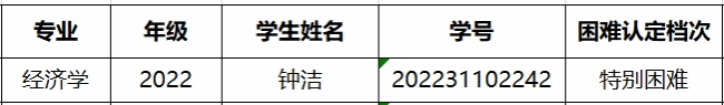 经班级民主评议小组评议认定、学院认定工作组审核,补充认定钟洁同学为2025-2026学年家庭经济困难学生,现予以公示。