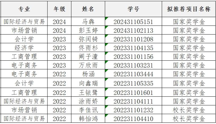 经本人申请、年级(班级)评议推荐、学院评审工作组评审,拟推荐马犇等10名同学参评国家奖学金、李佳讯等2名同学参评校长奖学金,具体名单见附件。按照工作程序,现予以公示。