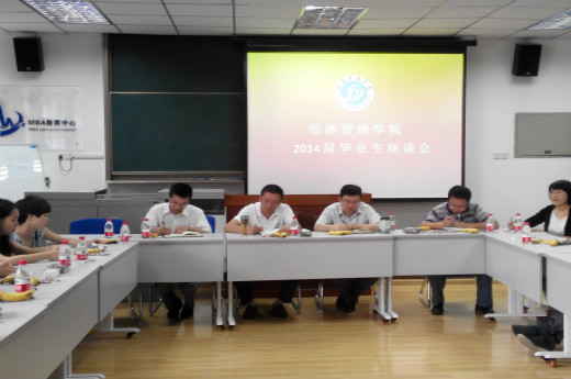 6月25日上午,经管院在博学楼B404召开了2014届毕业生代表交流座谈会。党委书记任皓、院长高军、党委副书记覃吉春、副院长郭志钢和学院各职能部门负责人、教研室主任参加了此次座谈。座谈会由覃吉春主持。